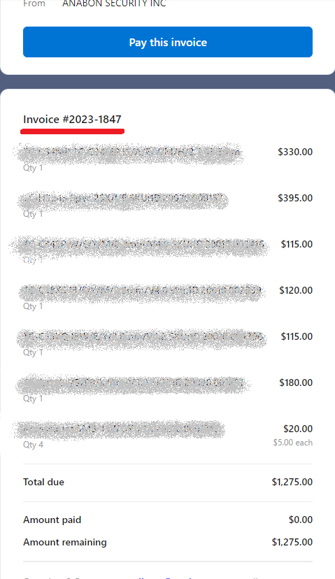 To get your invoice number, you can call and ask your account manager to read the number to you. And then enter it in the corresponding box. Anabon Security numbers are: